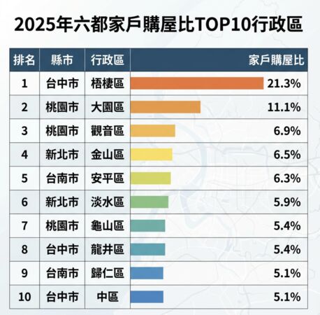 另值得關注的是,2025年六都家戶購屋比前10名行政區,台中市梧棲區以高達21.3%奪冠,意即每100戶中,就有超過21戶購屋,數據驚人。
