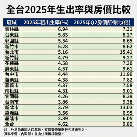 ▲全台2025年生出率與房價比較。資料來源:內政部,並由住商機構彙整。(AI協作/記者張雅雲製作,經編輯審核)